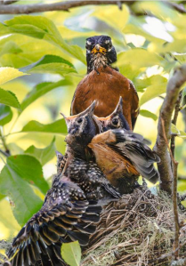 Robins can raise 2 or 3 clutches of eggs a summer, building their nests in the forks of tree branches, or open ledges.  The eggs are the familiar ‘robins egg blue’.  The newly hatched baby birds are voracious eaters and keep both the mother and father robins very busy all day long searching for and bringing back worms for hungry family.