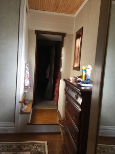 This is taken from the bathroom, looking into the little hallway between the bedroom, on the right and closet, on the left. It will be painted ‘Creamy’ also, the carpet will stay. I am thinking a small chest of drawers, or something like it, for linen storage, as there is no linen closet in this house.