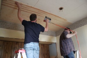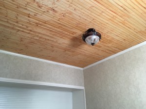 Tongue and groove wood strips were put up over the old original plaster ceiling. It covered a number of flaws.