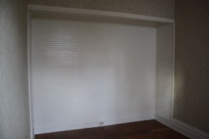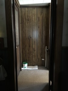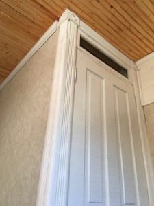 This section of wall, above the door to the hall that leads to the bathroom and closet, was too badly damaged. This was originally an outside wall also, but in a previous remodel, a door way was opened up in it. It was so bad that we just put up more tongue and groove wood and painted it to match the trim. I think that it looks just fine.