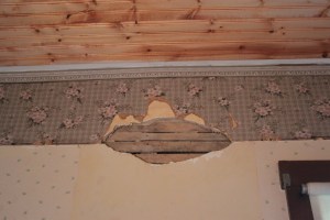 Here you can see a large hole in the plaster, and also where the drop ceiling came to-older wallpaper above, and newer below.